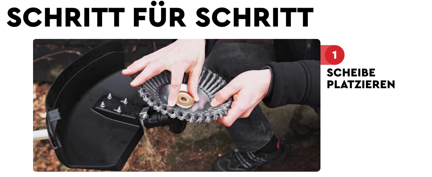 Die Bürste ist mit nahezu allen Trimmern kompatibel, die einen Aufsatz-Kopf von 25,4 cm Durchmesser haben – was die Installation einfach und schnell macht. Der Prozess ist unkompliziert: Alten Aufsatz entfernen, Bürste aufsetzen, Druckplatte anbringen und abschließend das Linksgewinde montieren. So bist du in kürzester Zeit bereit für die Gartenarbeit.