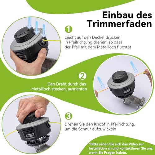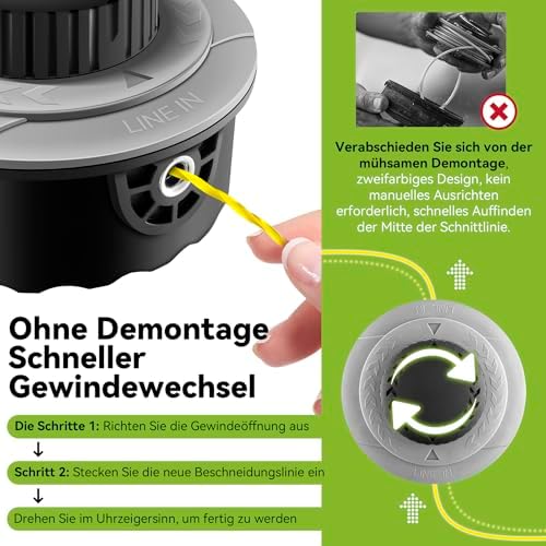 Die Fadenladung wurde durchdacht gestaltet, sodass kein Öffnen des Kopfes nötig ist. Einfach das Kabel einsetzen und schon können Sie starten! Mit 14 Fuß (0,95 Zoll) Trimmerlinie und einem zweifarbigen Design finden Sie schnell die Mittellinie, was das Nachladen zum Kinderspiel macht. Hergestellt aus hochwertigem Nylon, zeichnet sich der Faden durch Langlebigkeit und Widerstandsfähigkeit aus und verhindert ein Verwickeln der Spulen.