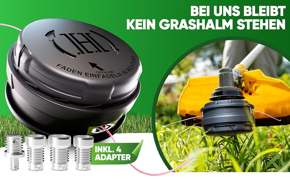 Heckenpracht® Fadenkopf für Motorsense mit Tap & Go System – Effizientes Mähvergnügen für Freischneider mit 5 Adaptern!