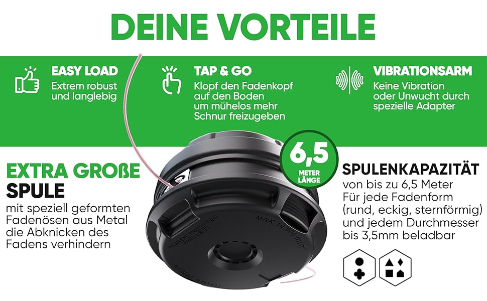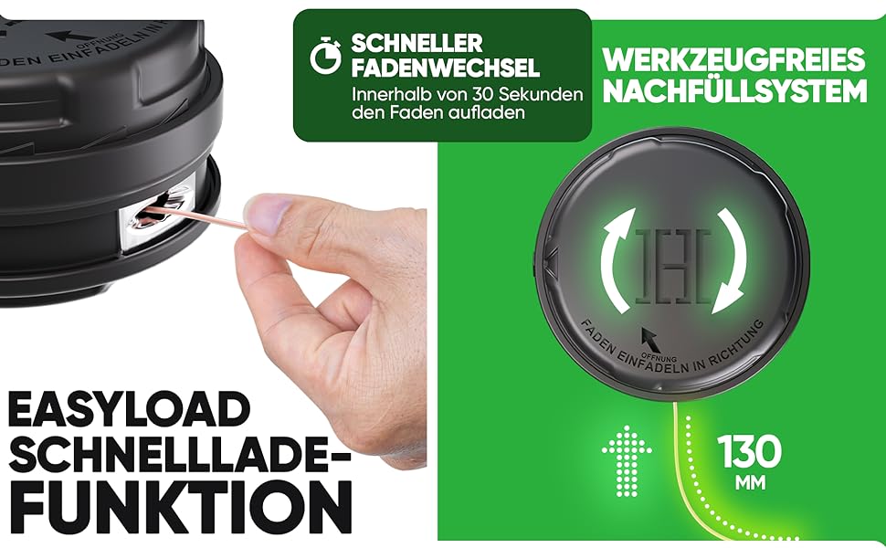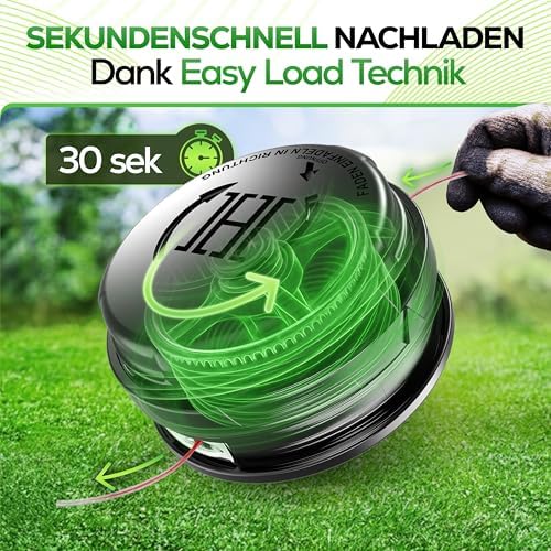 • Schnelles Nachladen: Mit der Easyload-Funktion laden Sie den Trimmerfaden in nur 30 Sekunden nach – kein Werkzeug nötig!