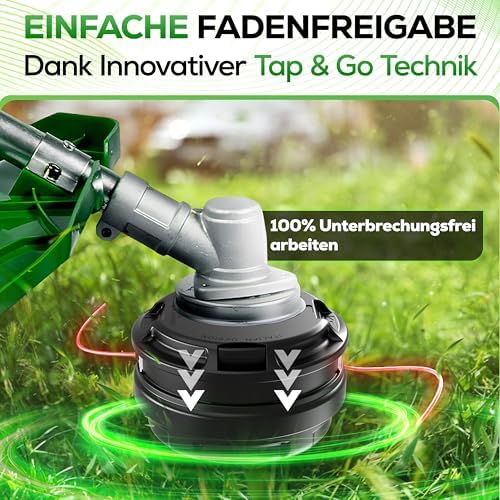 • Effiziente Tap & Go Funktion: Klopfen Sie einfach den Trimmerkopf auf den Boden und erhalten Sie sofort mehr Faden für ununterbrochene Gartenpflege.
