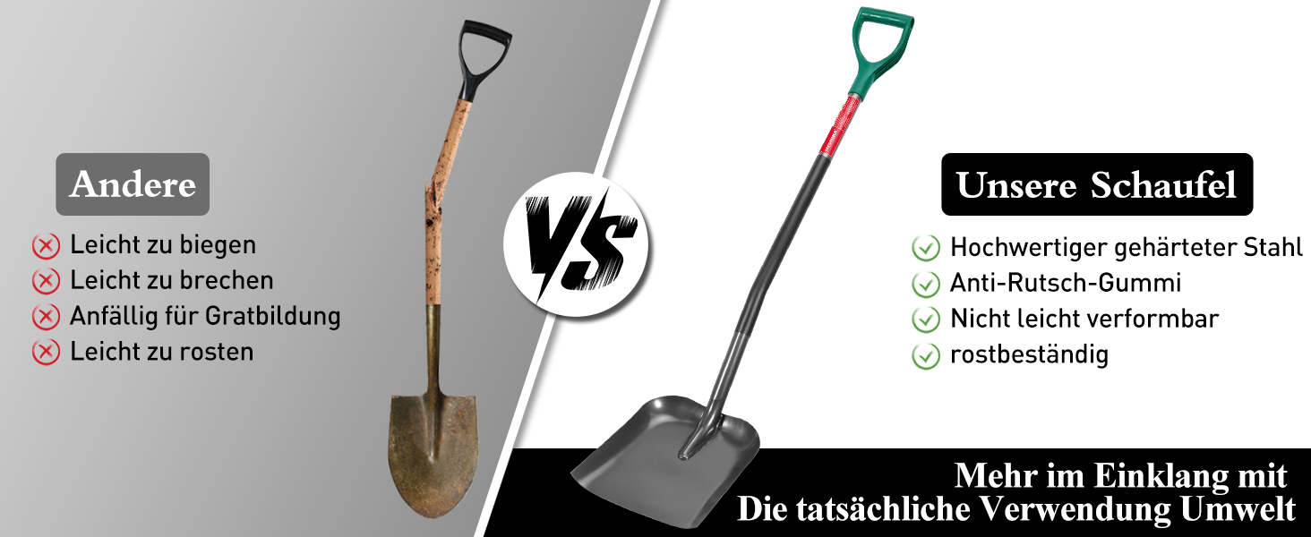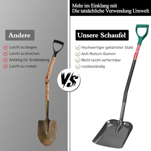 Insgesamt bietet unsere Manganstahl-Schaufel eine perfekte Kombination aus Qualität, Funktionalität und Langlebigkeit. Egal, ob Sie ein Hobbygärtner oder ein Profi im Bauwesen sind, dieses Werkzeug wird Ihre Erwartungen übertreffen und Ihnen in vielen verschiedenen Szenarien nützlich sein. Wählen Sie eine Schaufel, die für Ihre Bedürfnisse entwickelt wurde – Sie werden die Vorteile schnell zu schätzen wissen!