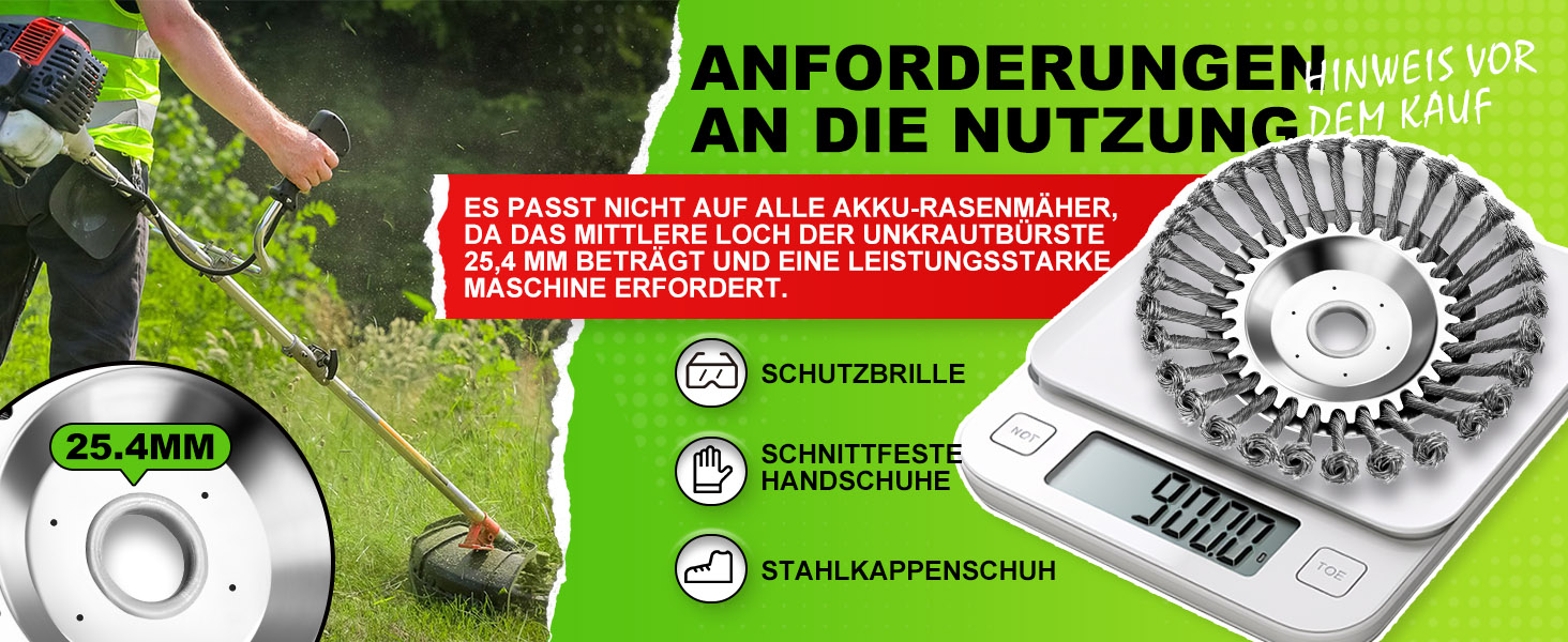 Die Abnutzung der Drahtbürste variiert abhängig vom Einsatzgebiet. Während beim Mähen von feinem Gras in Rasengärten ein sehr geringer Verschleiß auftritt, erhöht sich die Abnutzung beim Entfernen von Unkraut in Ecken oder zwischen Ziegeln. Nutzen Sie die Unkrautbürste regelmäßig, um die besten Ergebnisse zu erzielen und die Lebensdauer des Produkts zu verlängern.