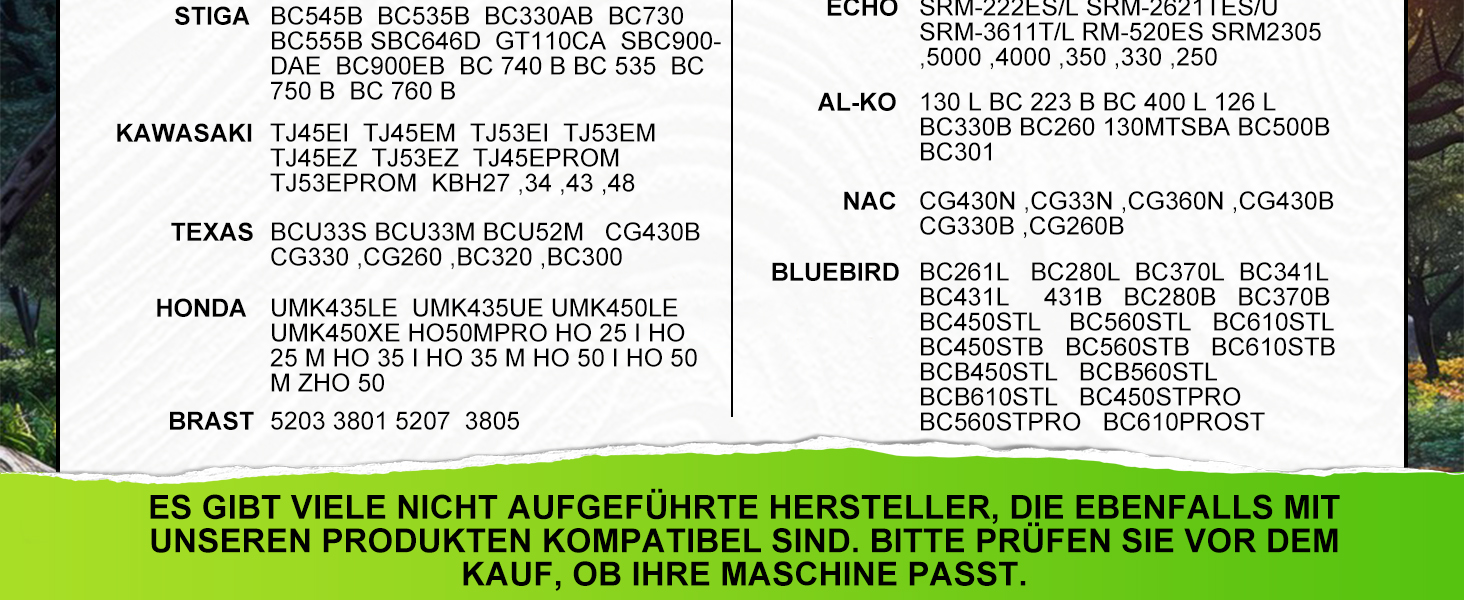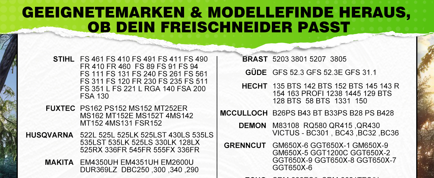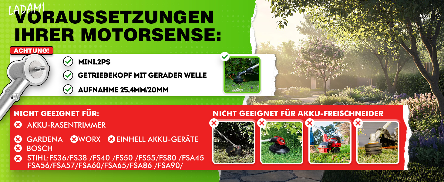 Dieses Produkt ist speziell für die Verwendung mit Benzin Freischneidern ab 1.2 PS konzipiert, die mit einem Standardanschluss von 25,4 mm (1 Zoll) oder 20 mm ausgestattet sind. Nicht geeignet für Elektroakku-Freischneider, bietet die Unkrautbürste maximale Effizienz und Leistung in Kombination mit kompatiblem Zubehör. Überprüfen Sie vor dem Kauf die Anschlüsse Ihrer Maschine, um eine optimale Nutzung zu gewährleisten.